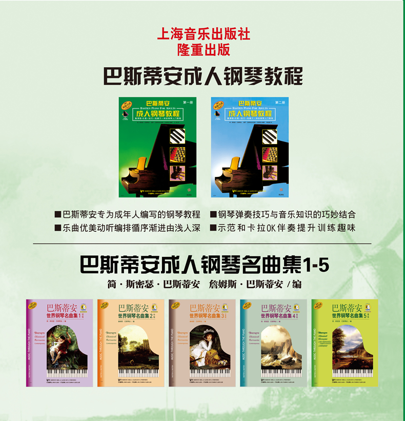 巴斯蒂安成人钢琴教程第一册 扫码赠送配套音频 原版引进成人钢琴教程是2011年由上海音乐出版社出版,作者简·斯密瑟·巴斯蒂安。