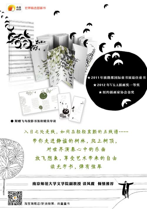 2011年博洛尼亚国际童书展童书 2012年V&A(维多利亚和阿尔伯特博物馆)插画奖一等奖 纽约插画家协会金奖 一曲对音乐的颂歌,一篇无字的乐章 带你走进静谧的树林,爬上树顶,对世界演奏自己心中的乐曲 放飞想象,享受艺术带来的自由 随书附赠精美的投影书签,在墙上投下翱翔的飞鸟 全书不着一字,但片片树叶比语言描绘的更加清楚。树叶暗喻音符,一位孤独的指挥家挥舞指挥棒,让树叶随之飞扬。空中的绿叶幻化成一道道崭新的风景,所有的一切都动了起来。原本安宁无声的书,有了韵律和动感,刹那间变成了一部美妙的电影!优美的线条,无声的音乐,一页连着一页在读者眼前展开,为读者带来艺术和音乐的盛宴,带来自然和世界的交响曲。