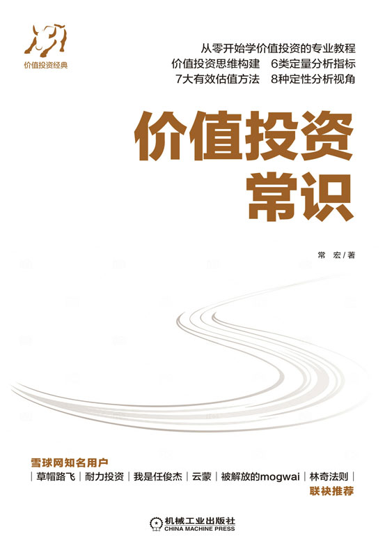 适读人群 :适合投资者学习和践行价值投资入门参考 从零开始学价值投资的专业教程 《价值投资常识》重点价值: 价值投资思维构建 六类定量分析指标 七大有效估值方法 八种定性分析视角 八匹价值投资白马 三大价值投资未来 雪球网知名用户 草帽路飞 耐力投资 我是任俊杰 云蒙 被解放的mogwai 林奇法则 联袂推荐
