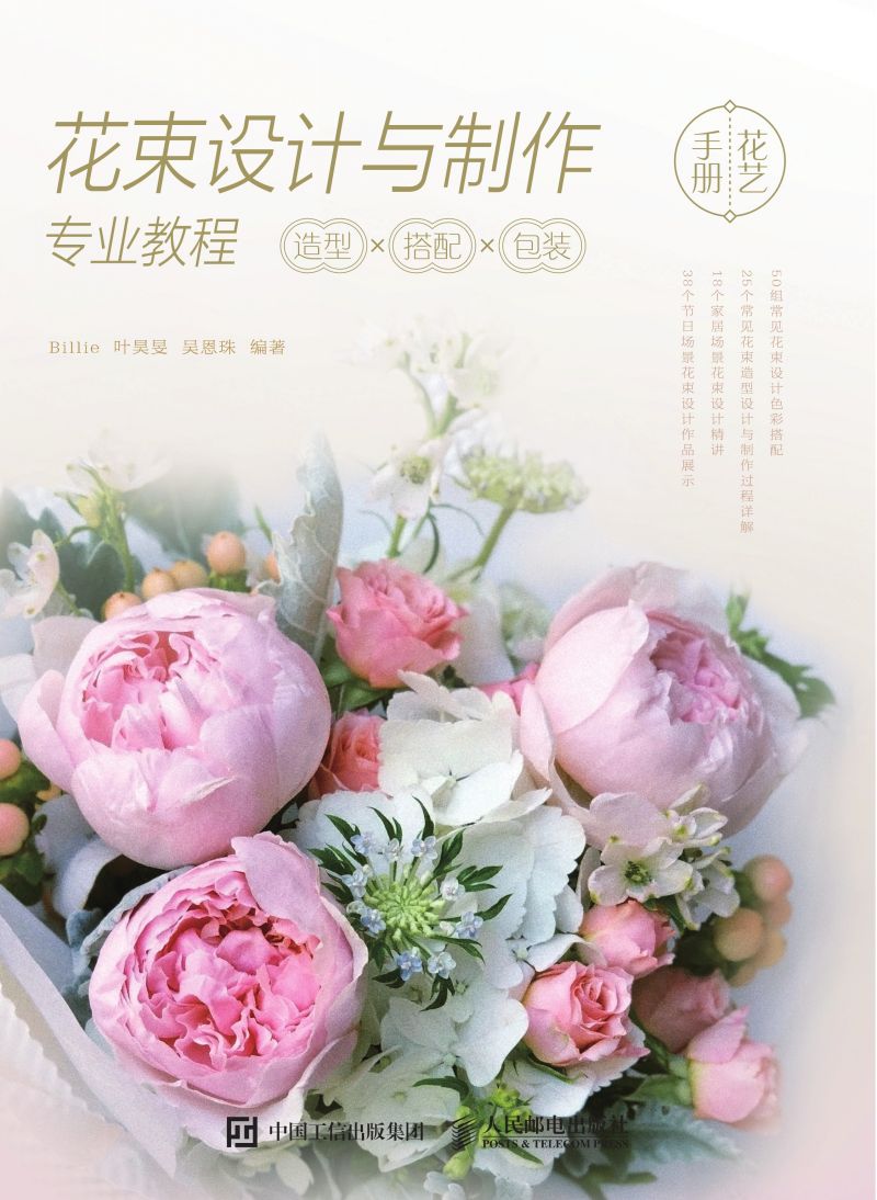 50组常见花束设计色彩搭配; 25个常见花束造型设计与制作过程详解; 18个家居场景花束设计精讲; 38个节日场景花束设计作品展示。