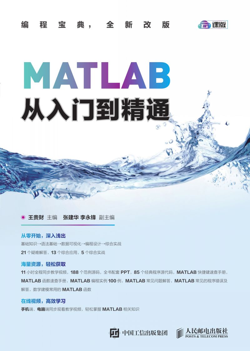 零基础、入门级的讲解 无论读者是否从事计算机相关行业,是否接触过MATLAB,是否使用MATLAB开发过项目,都能从本书中获益。 超多、实用、专业的范例和项目 本书结合实际工作中的范例,逐一讲解MATLAB的各种知识和技术。之后,还以实际开发项目帮助读者综合运用所学知识,从而提升实战经验,积累项目经验。 随时检测自己的学习成果 每章首页给出了“本章要点”,方便读者明确学习方向。 细致入微、贴心提示 本书在讲解过程中使用了“提示”“注意”“技巧”等小栏目,帮助读者在学习过程中更清楚地理解基本概念,掌握相关操作,并轻松获取实战技巧。 全程同步教学视频 涵盖本书所有知识点,详细讲解每个范例和项目的开发过程及关键点,帮助读者更轻松地掌握书中所有的MATLAB 程序设计知识。 超多电子资源大放送 赠送大量电子资源,包括 11 小时全程同步教学视频、188 个范例源码、全书配套 PPT、85 个经典程序源代码、MATLAB 快捷键速查手册、MATLAB 函数速查手册、MATLAB 编程实例 100 例、MATLAB 常见问题解答电子书、MATLAB 中常见的程序出错问题及解答电子书、数学建模常用到的 MATLAB 函数电子书。